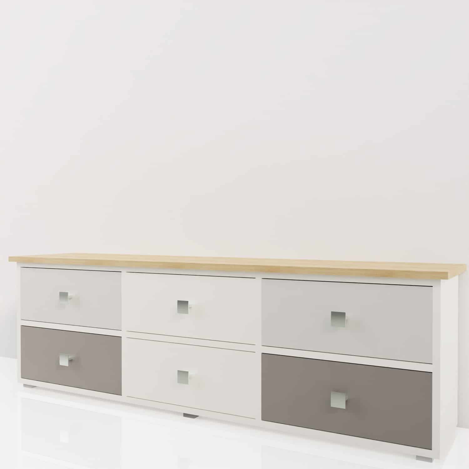 El blanco y el gris siempre son una apuesta segura en decoración. Este mueble ofrece un espacio de almacenamiento muy práctico, a la vez que complementa un estilo clásico y moderno.