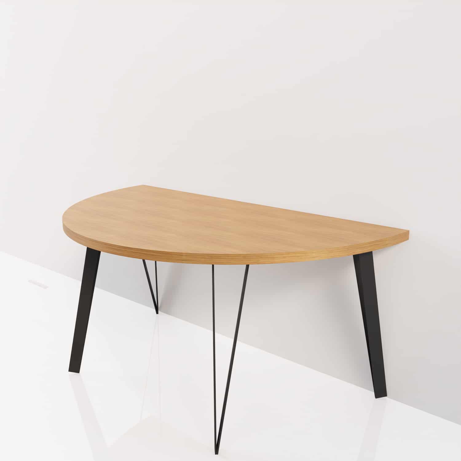 Una mesa semicircular con patas negras, ideal para completar tu sala de estar. Esta mesa complementa a la perfección una sala de estar o un comedor, aumentando su capacidad. Además de servir como elemento decorativo, puede albergar diversos objetos.
