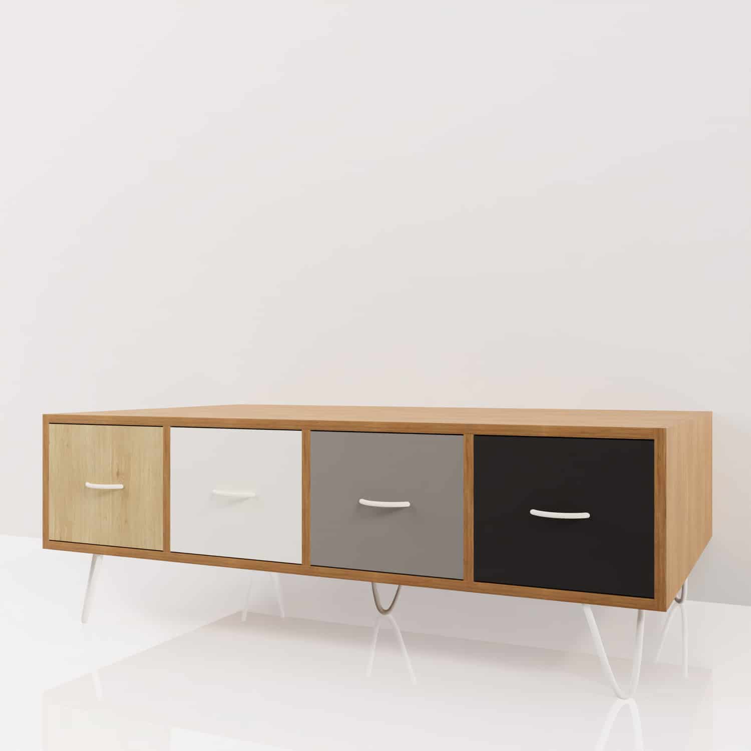 Soporte para TV con influencia de estilo escandinavo. Diseño sencillo y limpio que se integra perfectamente con cualquier tipo de decoración, a la vez que ofrece una solución de almacenamiento.