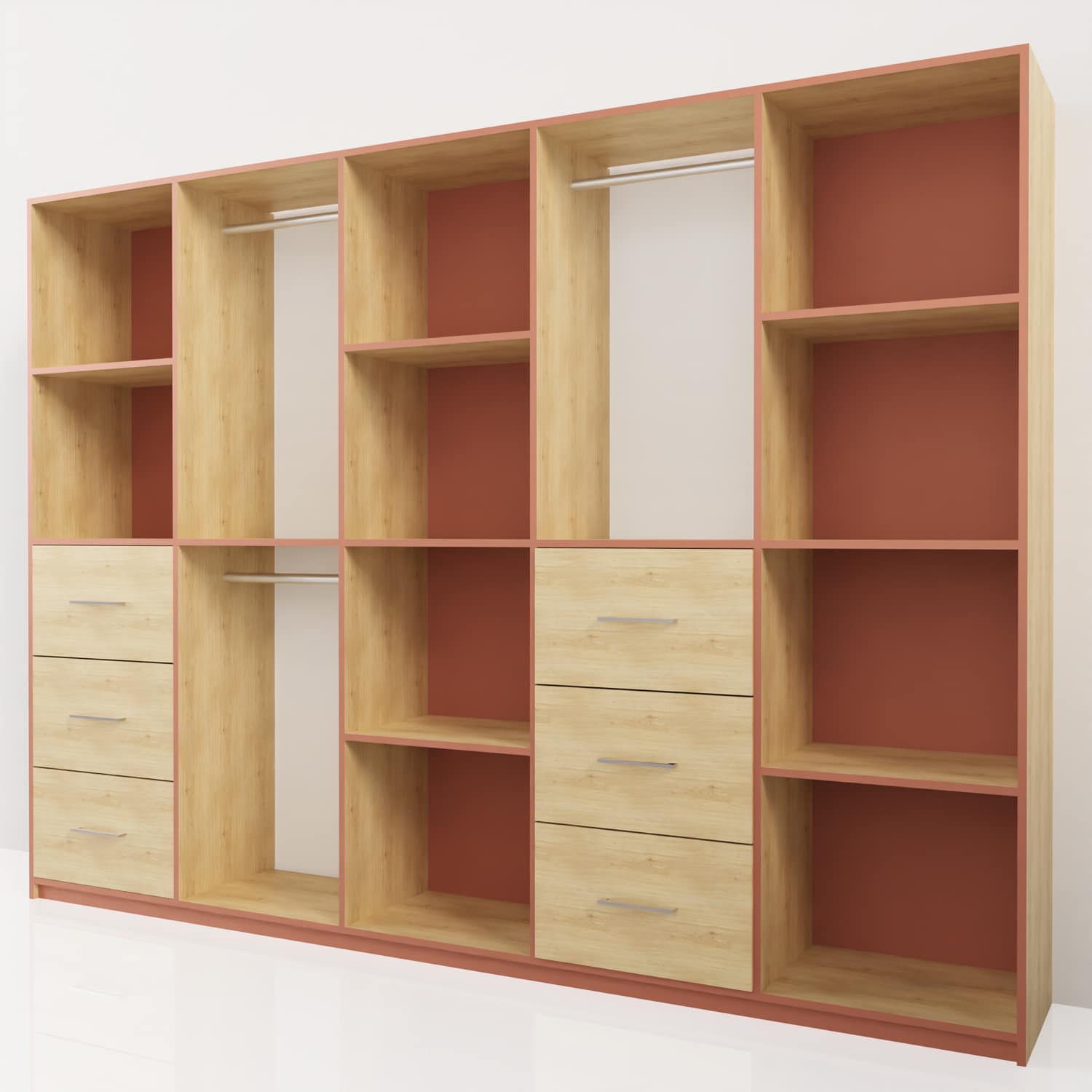 Descubra este espacioso vestidor con encantadores acabados, que combinan madera clara con detalles en terracota para una estética cálida y moderna. Este vestidor ofrece una gran área de almacenamiento con numerosos estantes, barras para colgar ropa y cajones. Un mueble sencillo pero elegante.