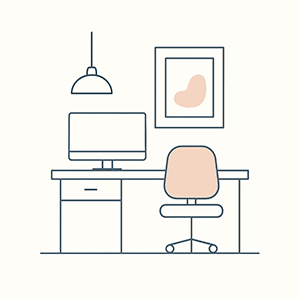Este escritorio se integra tanto en una oficina dedicada como en un dormitorio o en un espacio de vida, para ofrecer un puesto de trabajo práctico, estético y duradero, pensado para un uso diario.