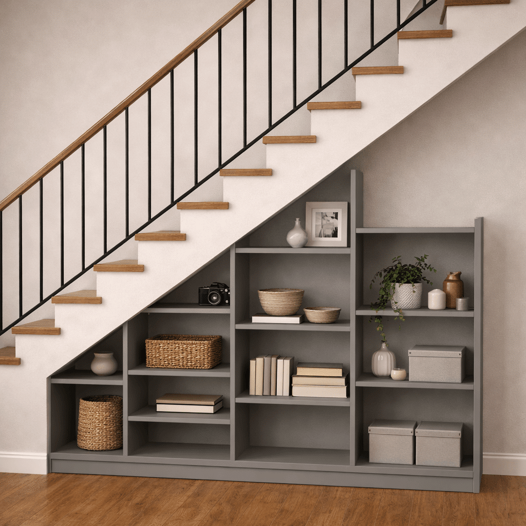 Este mueble de escalera a medida con estantes es ideal para transformar un espacio que a menudo no se usa en un área de almacenamiento práctica y estética. Gracias al hecho a medida, cada detalle es completamente personalizable: dimensiones, acabados y disposición de los estantes, para crear un mueble único perfectamente adaptado a la configuración de su escalera. De este modo, optimiza cada rincón y aporta un toque elegante a su interior.